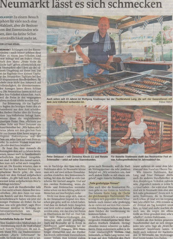 Im Artikel über das Neumarkter Volksfest 2013 finden Sie auch einen Beitrag über die Imbiss + Fischbraterei Lang.