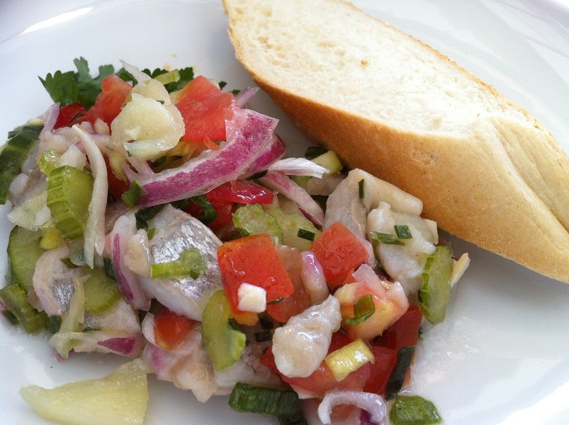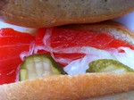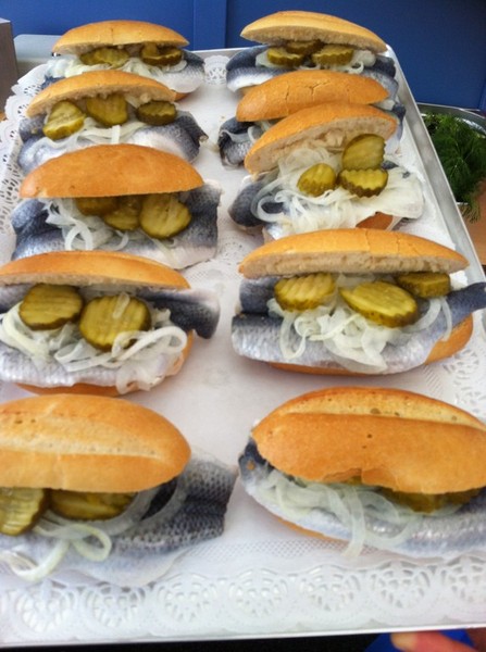 - Matjesbrötchen (mit gebeizten Zwiebelringen und Gurke)
