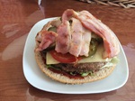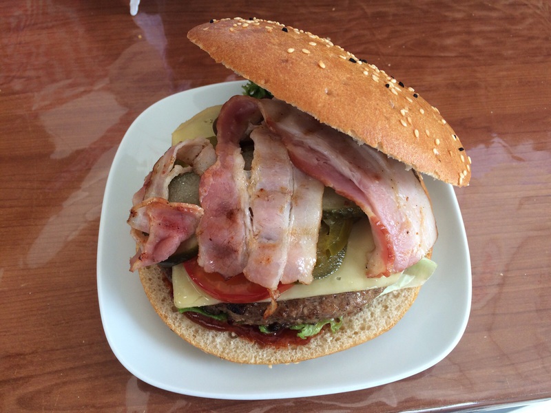 - Feines Rinderhack in der Semmel mit Käse, frischem Salat, Tomate, Gurke, Zwiebel und Sauce inkl. (nach Wahl) mit Speck und Jalapenos