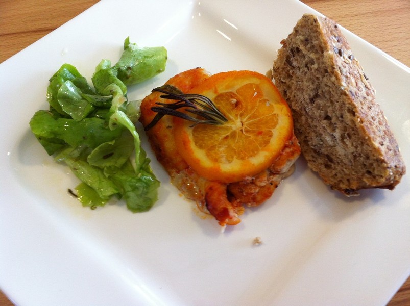 - Pangasiusfilet „Garnele-Orange“ in pikanter Marinade mit Garnele und Orangenscheibe
